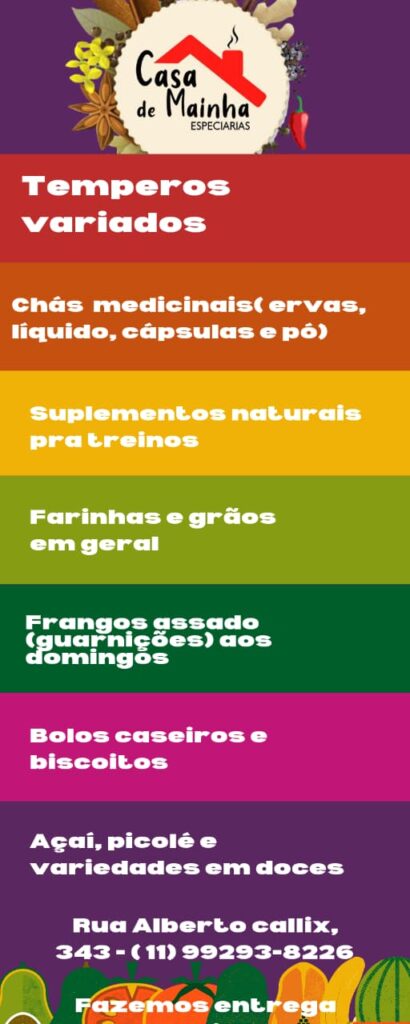 Casa de Mainha Especiarias é a loja completa de produtos naturais no bairro. Aqui você encontra uma seleção especial de suplementos, chás, temperos e especiarias, tudo pensado pra cuidar da sua saúde, sabor e bem-estar no dia a dia. ️